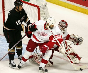 I selected this picture for a couple reasons. First is number 22, Brett Lebda. A recent addition to the Wings, but has everything it would take to become the next Lidstrom or Yzerman even. A defensive player with a thirst for getting the puck to the net, but who will sacrifice everything of himself to help out his own goalie.