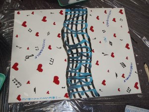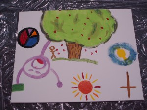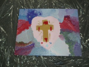 So what to do? Make your own. 🙂 Grab some paint, and some canvasses, and be sure to prepare in advance via drop cloths and regulations to keep it semi-controlled. I told my teens to “create”, and not to worry about making something with a cross or Jesus on it…but I wouldn’t stop them from doing it either. Turns out we had creative teens in our group, and teens who enjoyed creating. 🙂 Here are a few…