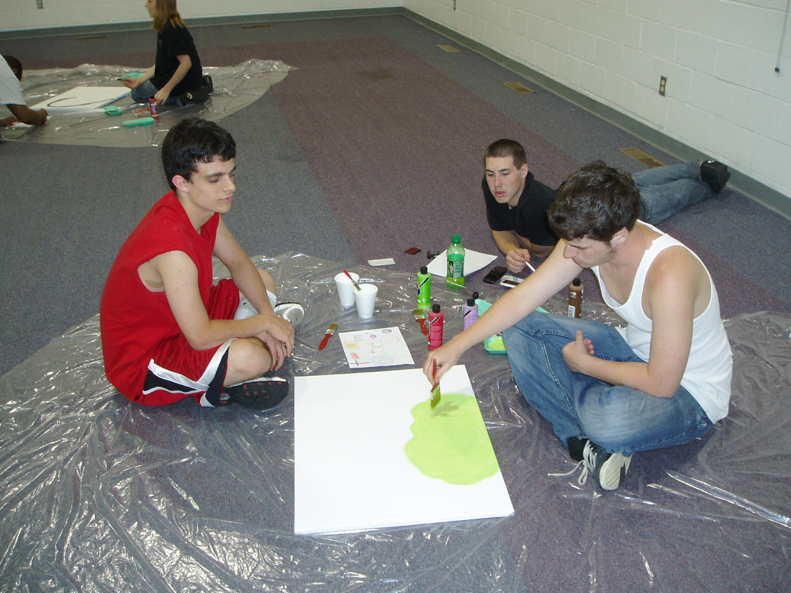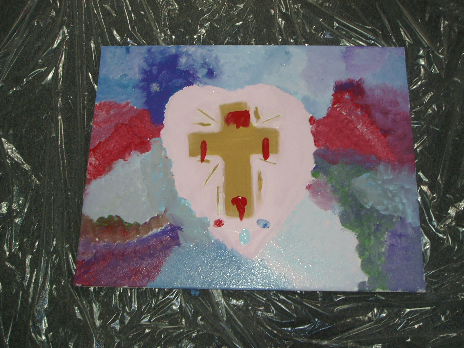 So what to do? Make your own. 🙂 Grab some paint, and some canvasses, and be sure to prepare in advance via drop cloths and regulations to keep it semi-controlled. I told my teens to “create”, and not to worry about making something with a cross or Jesus on it…but I wouldn’t stop them from doing it either. Turns out we had creative teens in our group, and teens who enjoyed creating. 🙂 Here are a few…