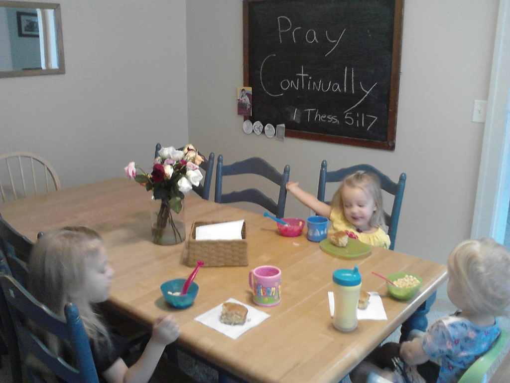 We were sitting at the breakfast table, talking about the Bible verse our whole church is memorizing this week. I’m thankful for the giant chalk board my wife Sarah acquired for just such purposes. Sidenote: I’m even more thankful to be blessed by a wife/mother of our children who sees a chalkboard as a functional piece of dining room decor. What would be better, a generic painting of flowers and a french cafe….or a chalkboard to teach our kids scripture during the everyday moments? 🙂 Take that, Martha Stewart. I love my wife.