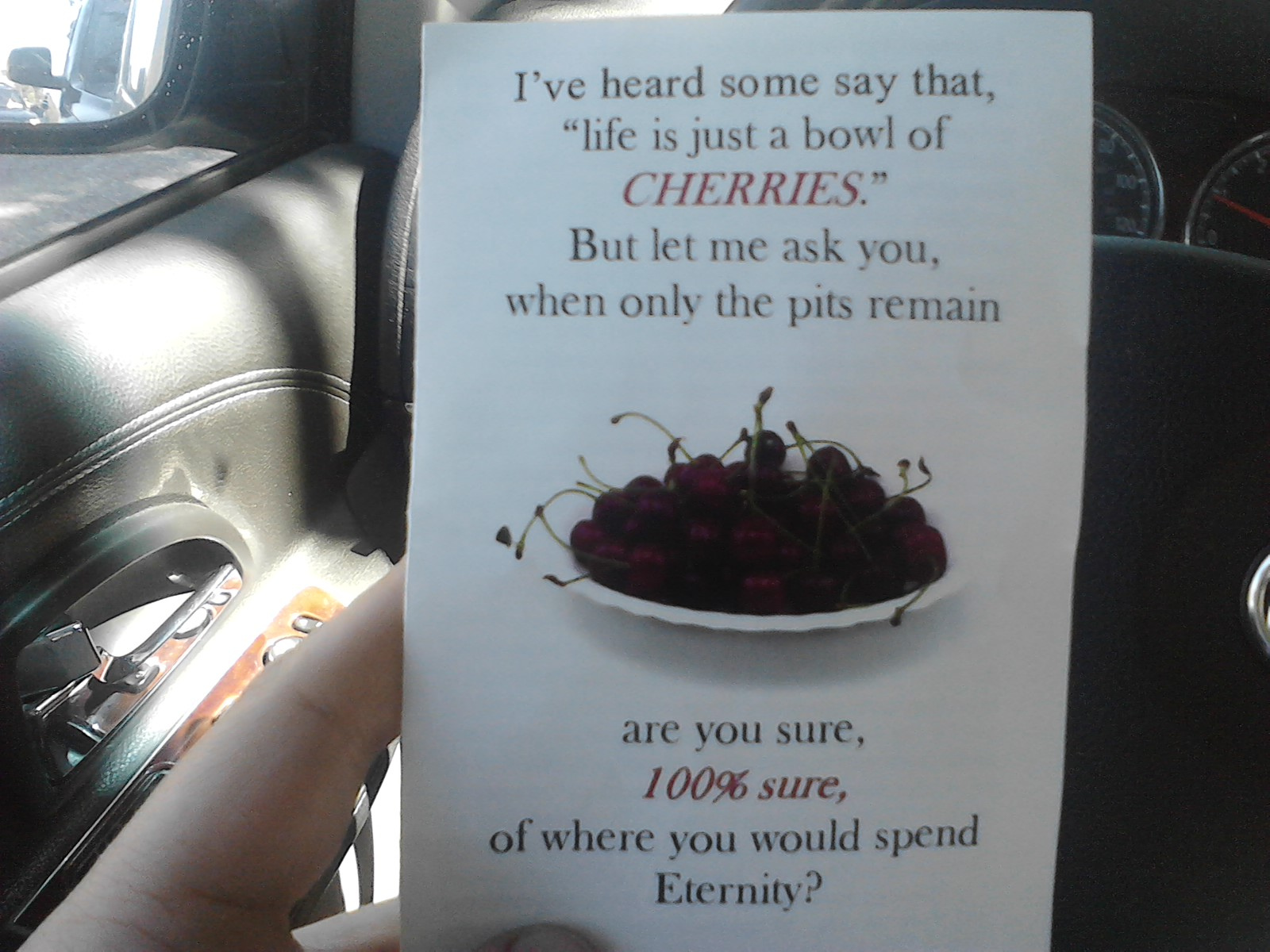 We were standing outside the porta-potties, with an odd mixture of urinal wafers and cherry juice hanging in the thick humidity of July…when a man with long pants, long sleeves, and sweating painfully through a neck-tie smiled and handed me this flier: