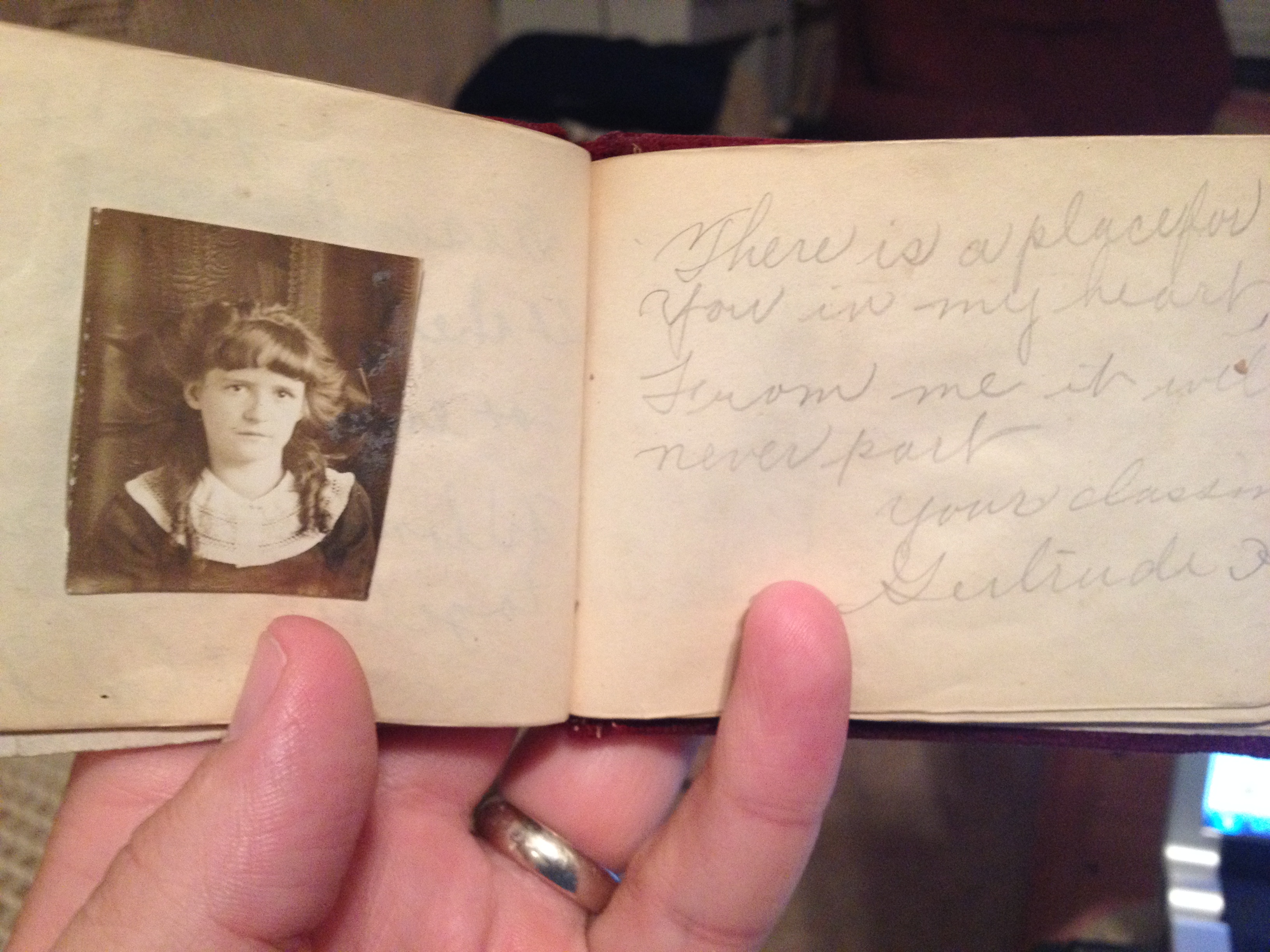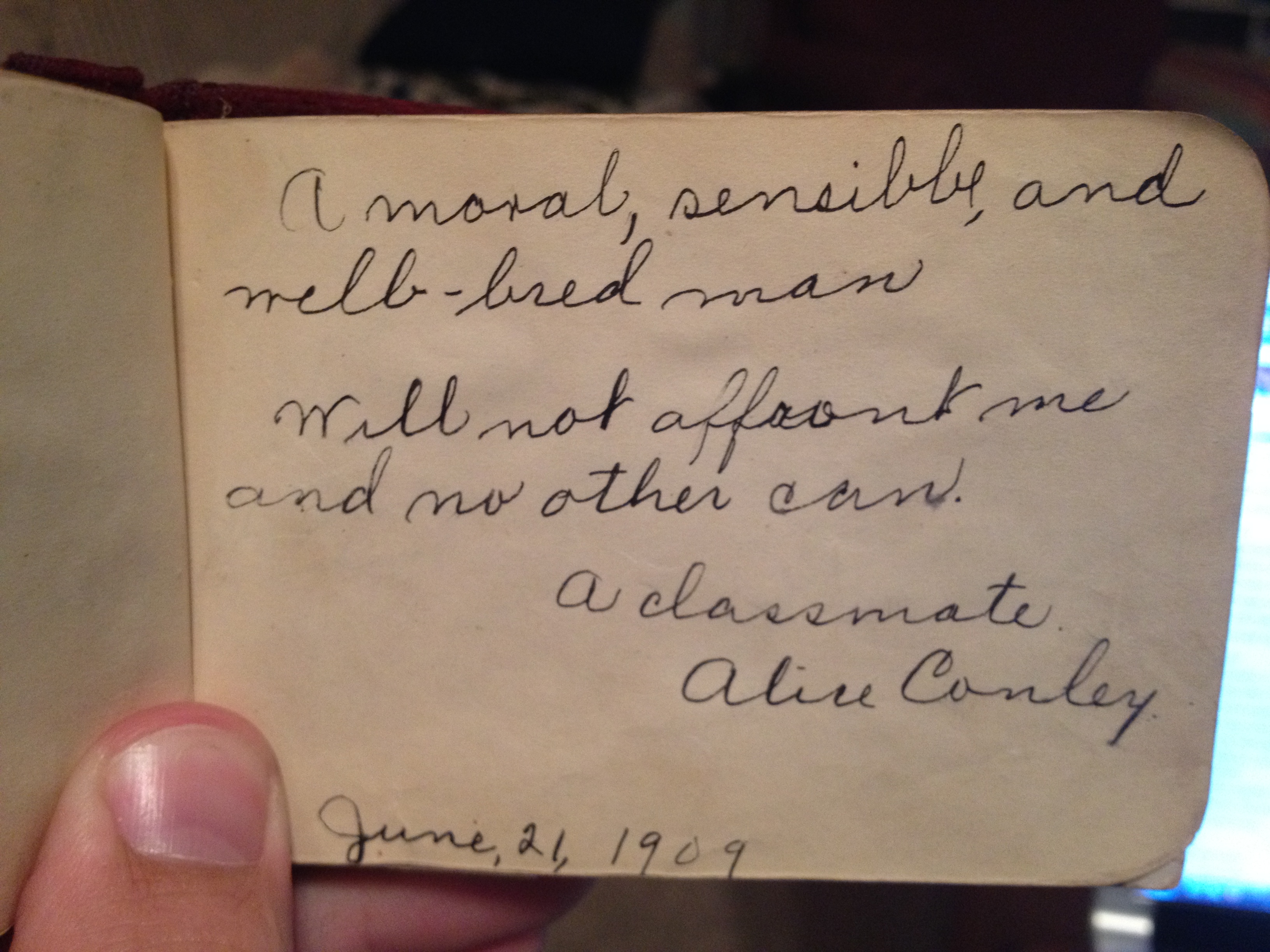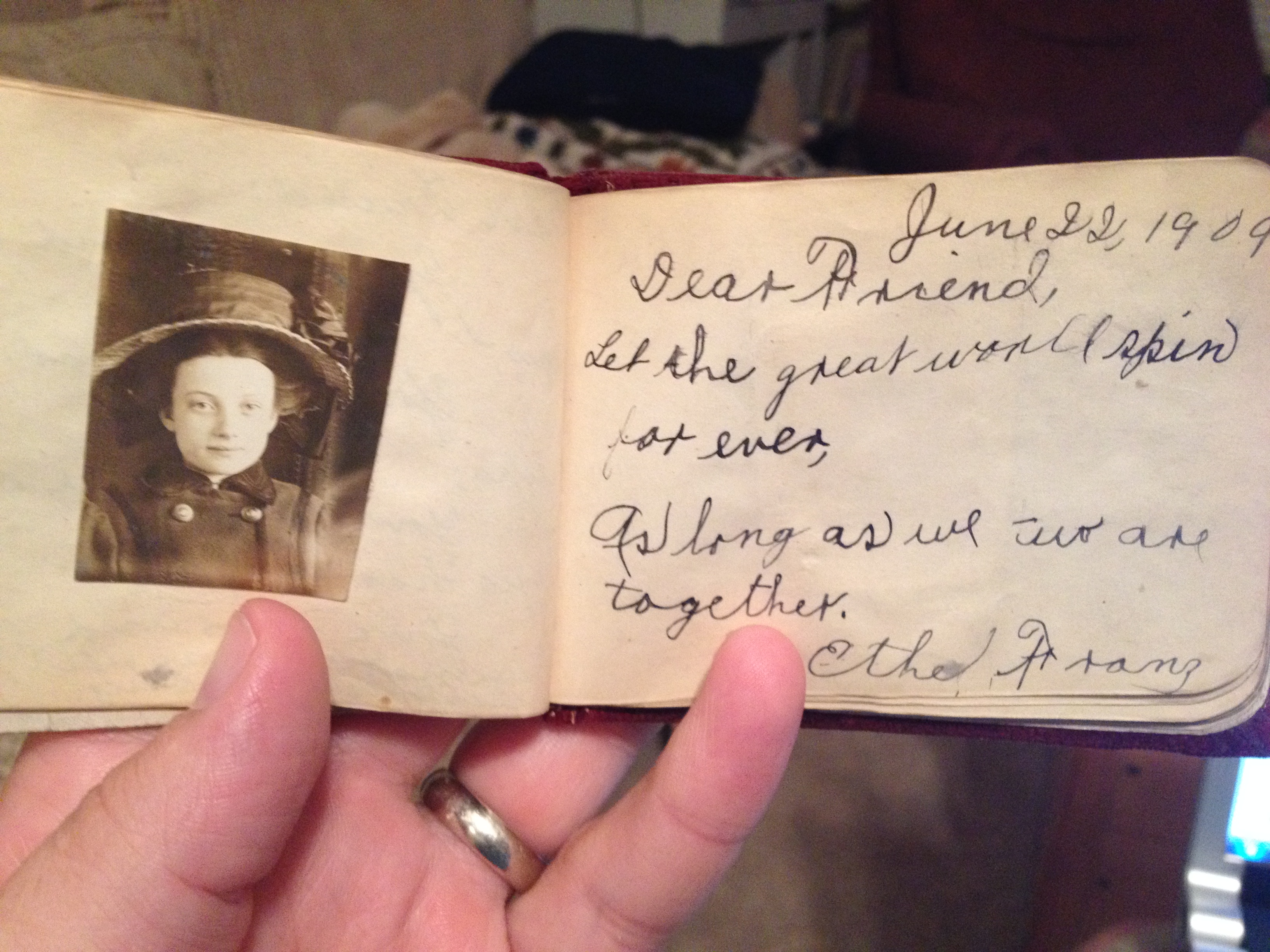 I won a box of stuff at an estate auction last week. There are some really cool bits of history in it, and I”m selling several of the items on E-bay. But among the “stuff”, is this really awesome item. It’s a sort of “autograph book”. Owned by someone named “Lizzie”, it was given to her in 1900, and she had friends sign it over the next 15 years…here are just a few of the pages…