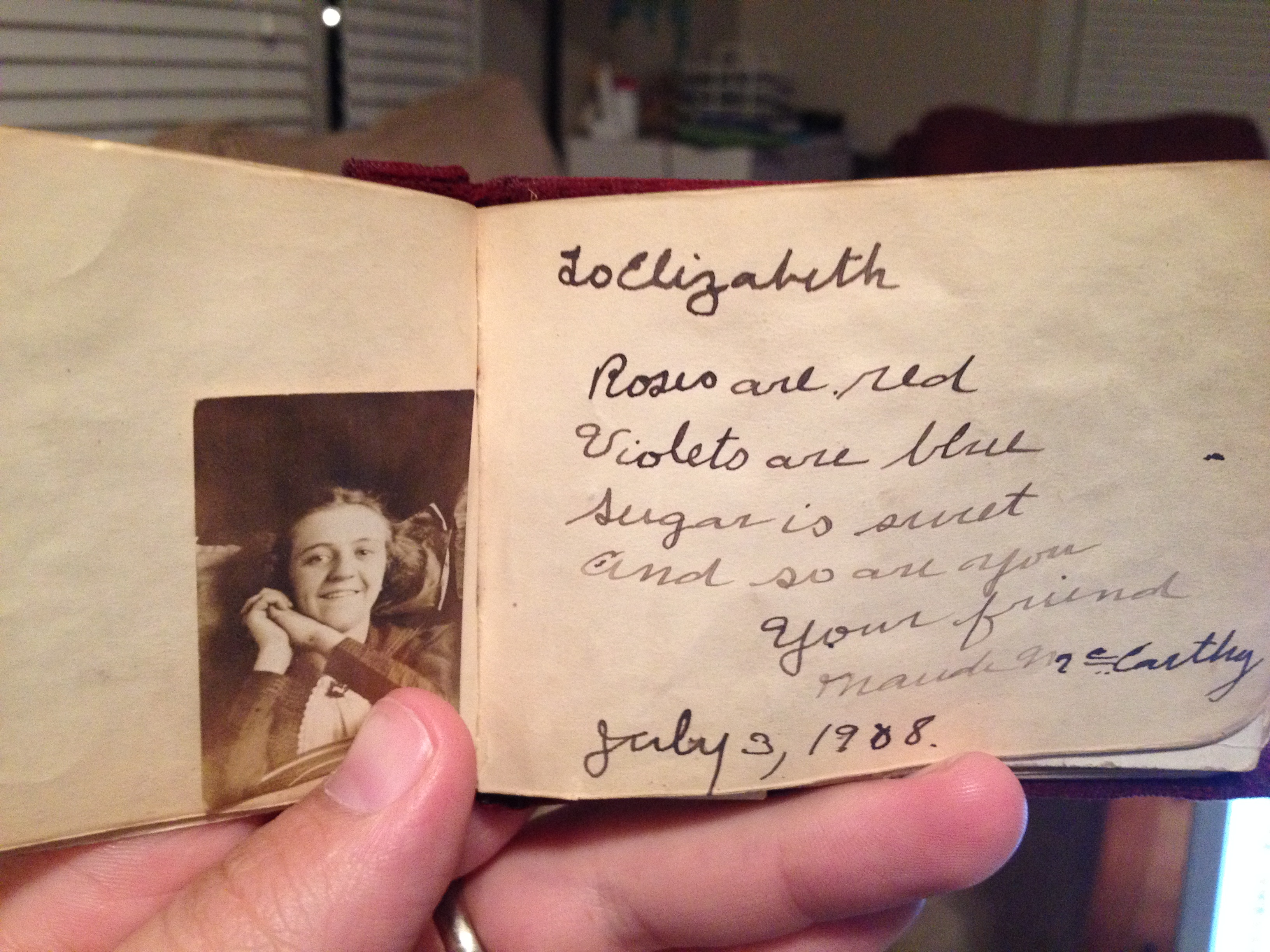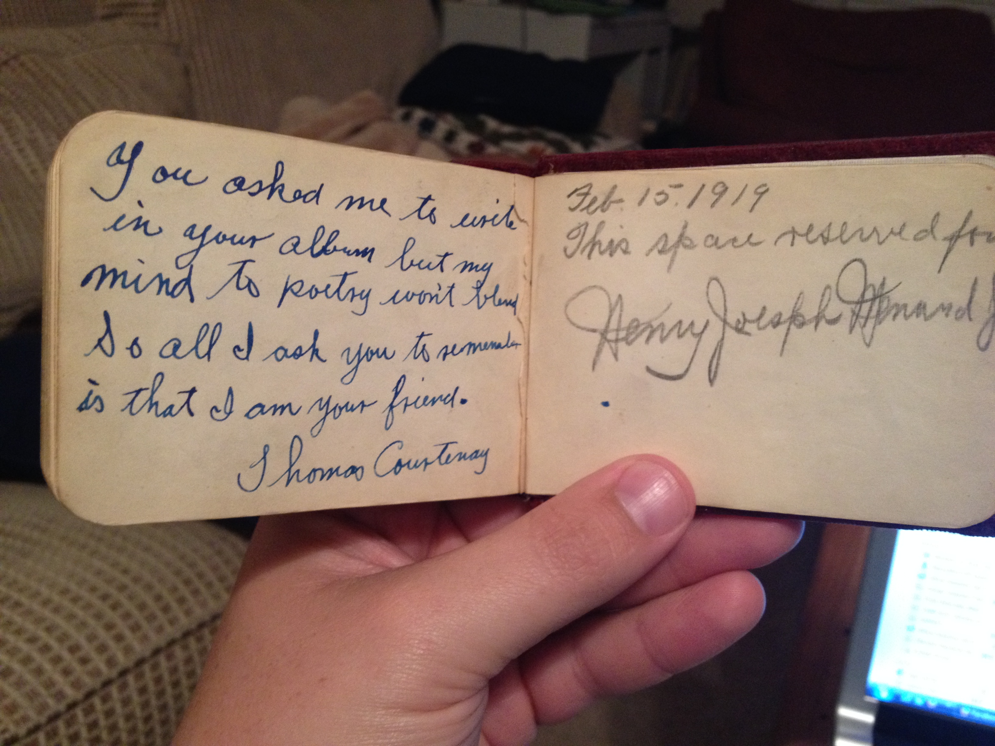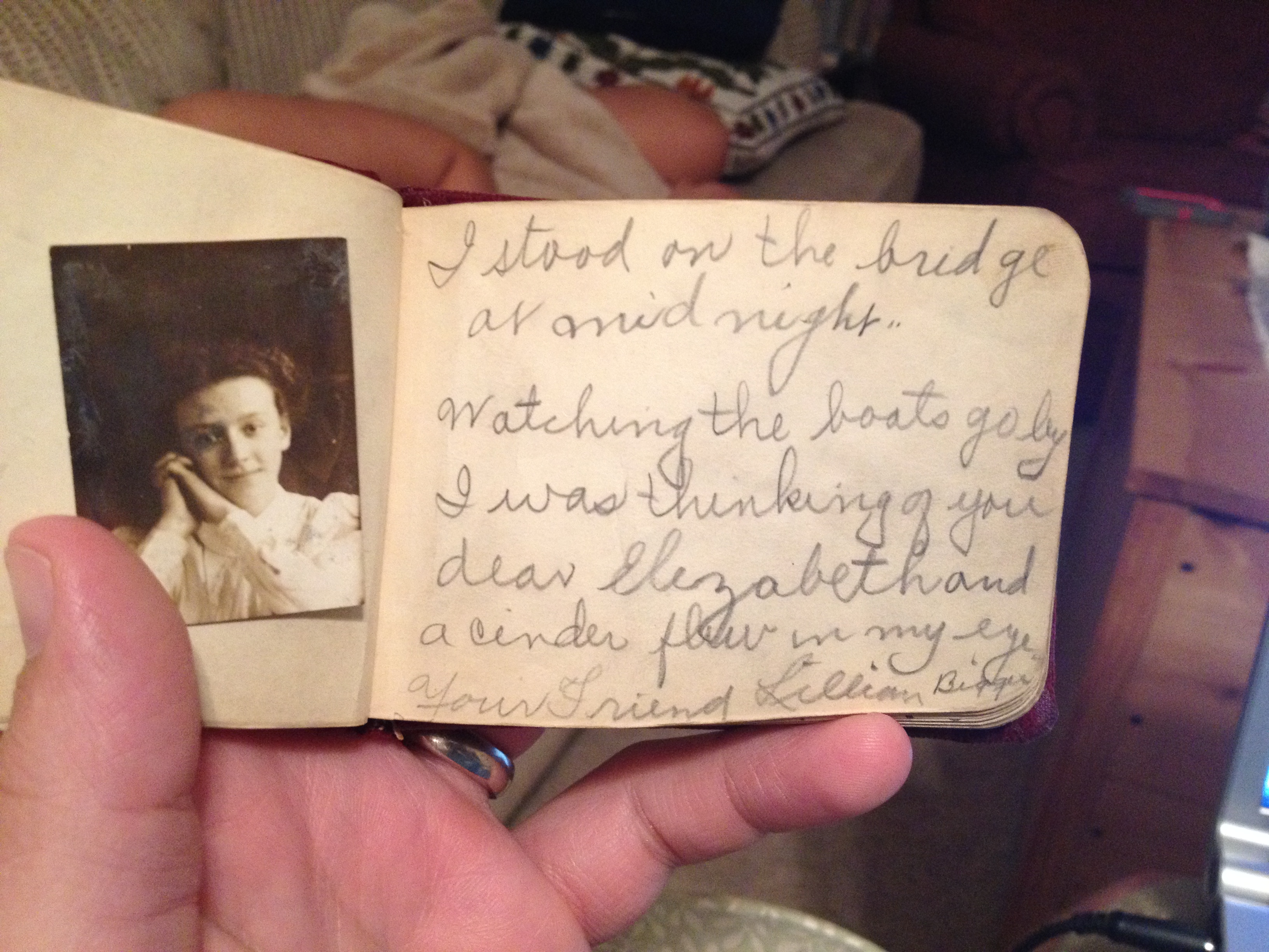 I won a box of stuff at an estate auction last week. There are some really cool bits of history in it, and I”m selling several of the items on E-bay. But among the “stuff”, is this really awesome item. It’s a sort of “autograph book”. Owned by someone named “Lizzie”, it was given to her in 1900, and she had friends sign it over the next 15 years…here are just a few of the pages…